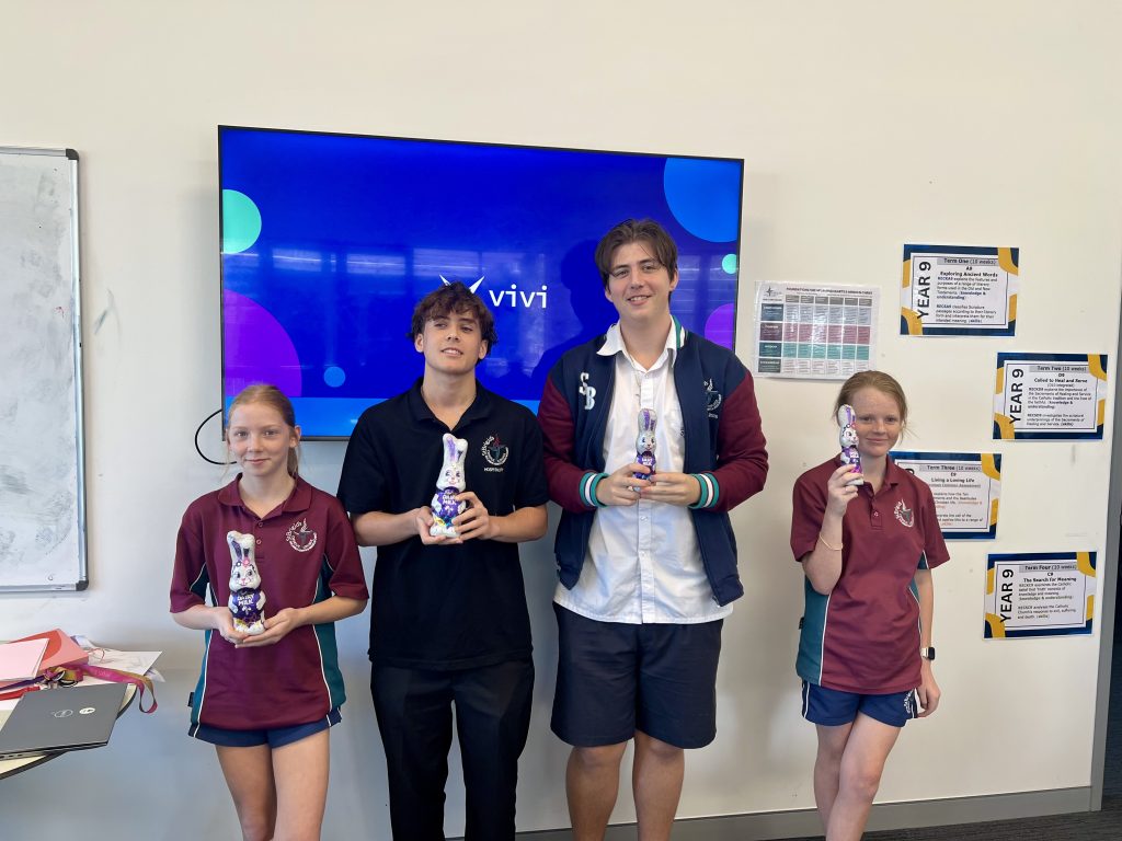 Thank you to the students and staff who attended our last Youth Ministry meeting for Term One. The students who will be completing their sacraments this Easter shared their experience of preparation and invited the group to join them at St Mary’s Toukley at 6pm on Saturday, 4th April, all families are welcome to join. Students participated in small group discussions, and everyone received a lucky door prize ticket. We had four lucky winners who won a chocolate rabbit. We ended the meeting by distributing easter eggs and thanking everyone for a great term of Youth Ministry.